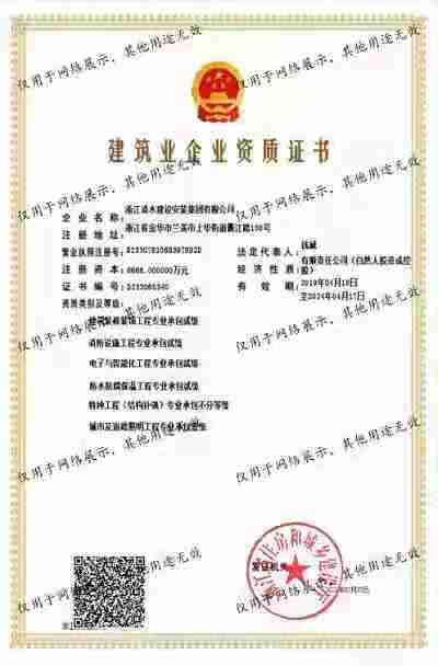 浙江清水建設(shè)安裝集團有限公司成立于2013年,注冊資金6688萬元。集團具有消防設(shè)施工程專業(yè)承包壹級、城市與道路照明專業(yè)承包壹級、電子與智能化專業(yè)承包壹級、建筑裝飾裝修專業(yè)承包貳級、防水防腐保溫專業(yè)承包貳級、市政工程施工總承包貳級、機電工程施工總承包貳級、建筑工程施工總承包貳級、電力工程施工總承包貳級、機電工程專業(yè)承包貳級、環(huán)保工程專業(yè)承包貳級、古建筑工程專業(yè)承包貳級、特種工程結(jié)構(gòu)補強專業(yè)承包、建筑施工勞務(wù)作業(yè)專業(yè)承包(憑建筑業(yè)企業(yè)資質(zhì)證書經(jīng)營